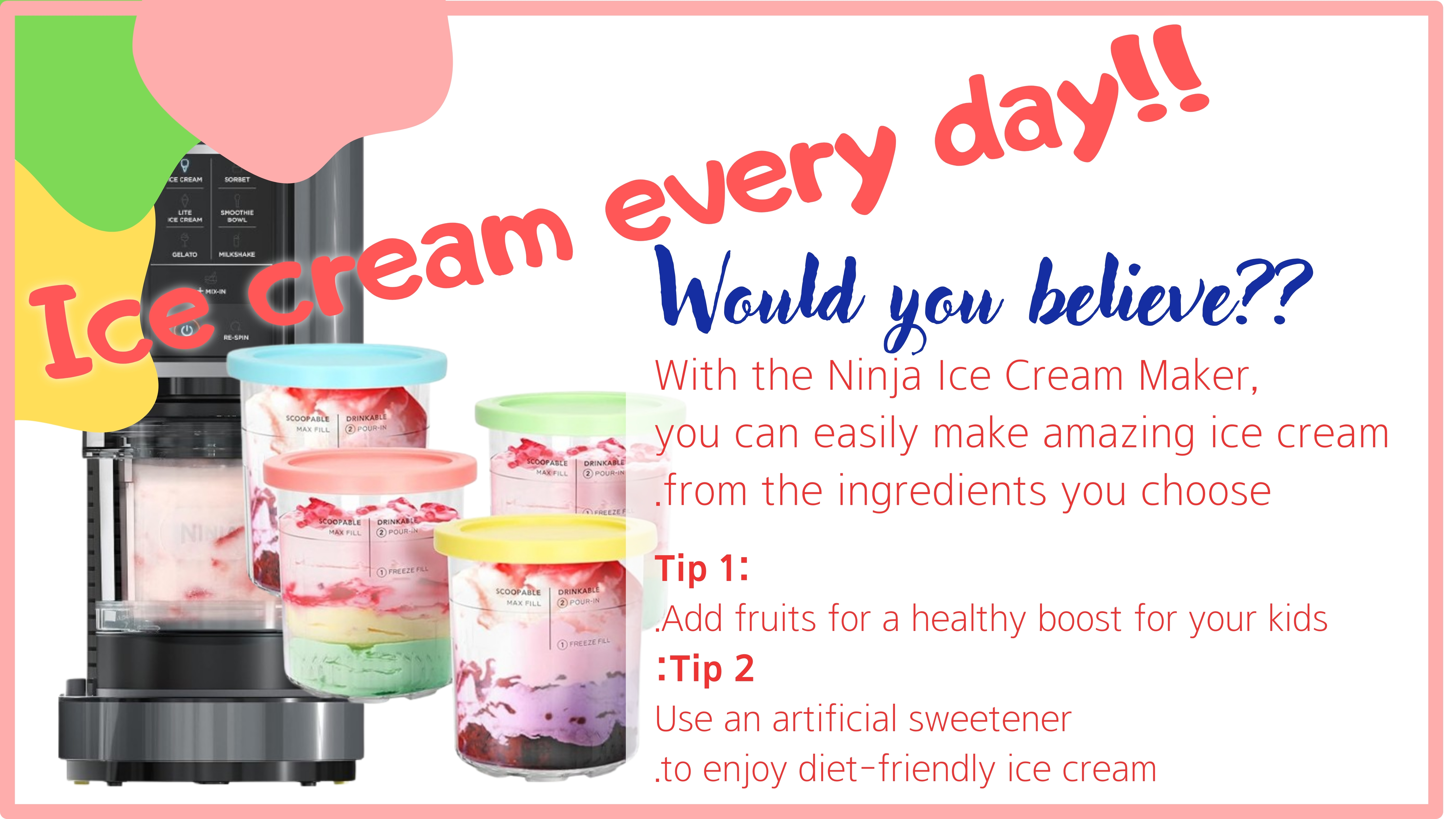 I recommend surprising your family (and yes, it’s okay for you to feel like a kid too) with theNinja Ice Cream Maker. It gives you endless possibilities to create ice creams every day, all day long.